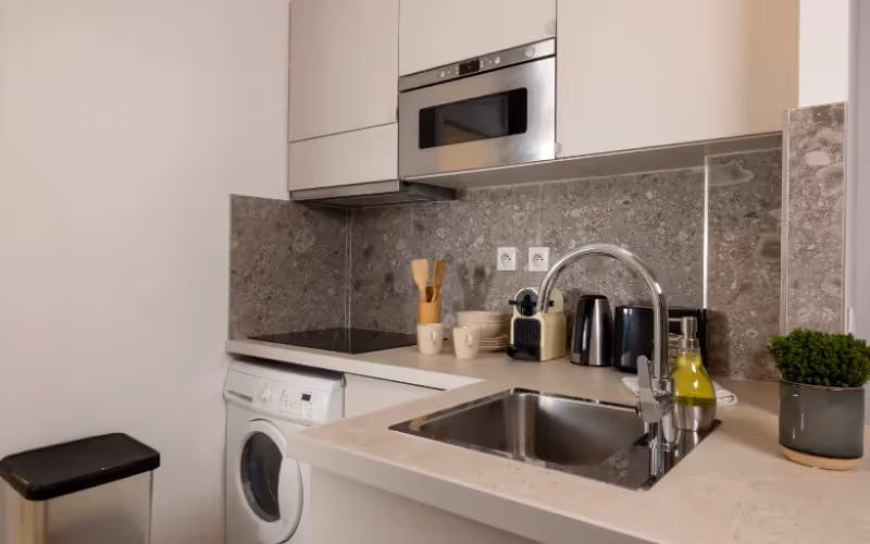 A l’entrée, vous serez frappé par la décoration raffinée et moderne du lieu. Le coin nuit, conçu comme un nid douillet, est un espace de détente relaxant et confortable. L’appartement offre de beaux espaces de rangement pour y passer quelques nuits ou quelques mois. La kitchenette est parfaitement équipée pour y préparer tous vos repas avec un lave linge