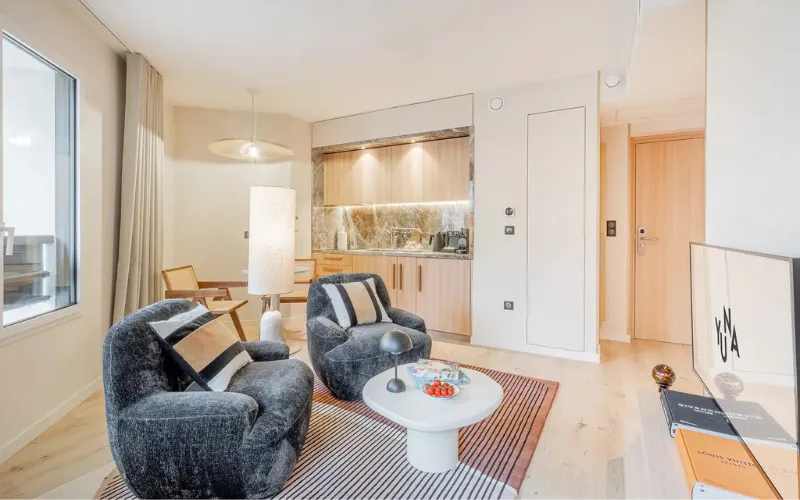 Découvrez l'appartement Deluxe 2 personnes : 35 m² de raffinement, avec chambre spacieuse, salon cosy, kitchenette équipée et salle de bain élégante. Un écrin design pensé pour allier bien-être et fonctionnalité, parfait pour une escapade à deux placée sous le signe du style et du confort.