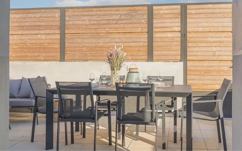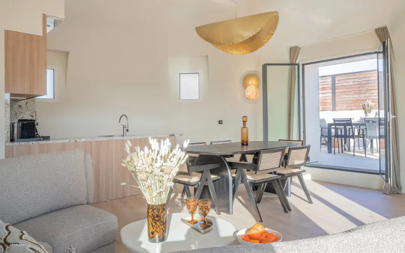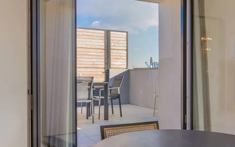 Niché au dernier étage de l’hôtel, cet appartement duplex de 90m² sur deux niveaux offre une vue imprenable sur la ville et garantit une intimité exclusive. Avec ses deux chambres spacieuses, ses terrasses magnifiques et une salle de bain équipée de deux WC séparés, il représente l’apogée du luxe résidentiel. Idéal pour accueillir jusqu’à 6 adultes grâce à son salon polyvalent avec lit pliant, cet appartement est l’adresse la plus prestigieuse de l’hôtel.