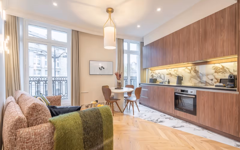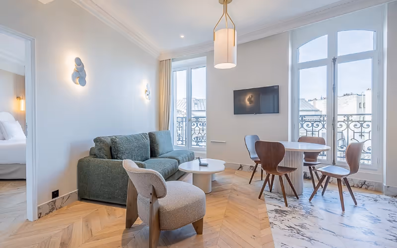 With its 80 m², one of the largest in the apart-hotel, this 3-room apartment has two terraces, one from the living room and the other from a bedroom. Located on the inner courtyard, it guarantees absolute calm, while offering modern comfort and a serene atmosphere, in the heart of Paris.