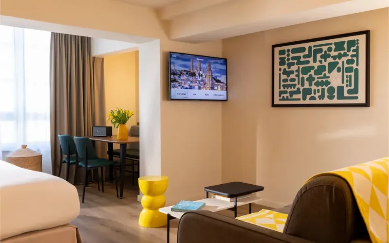 Stay in style in our 40m² Premium Studio, perfect for a couple with young children. Spacious and bright, it offers a large living room with equipped kitchen, high-end bedding, sofa bed and modern bathroom. A refined cocoon, complemented by 4-star hotel services 24 hours a day, a welcoming lobby, luggage storage and à la carte services.